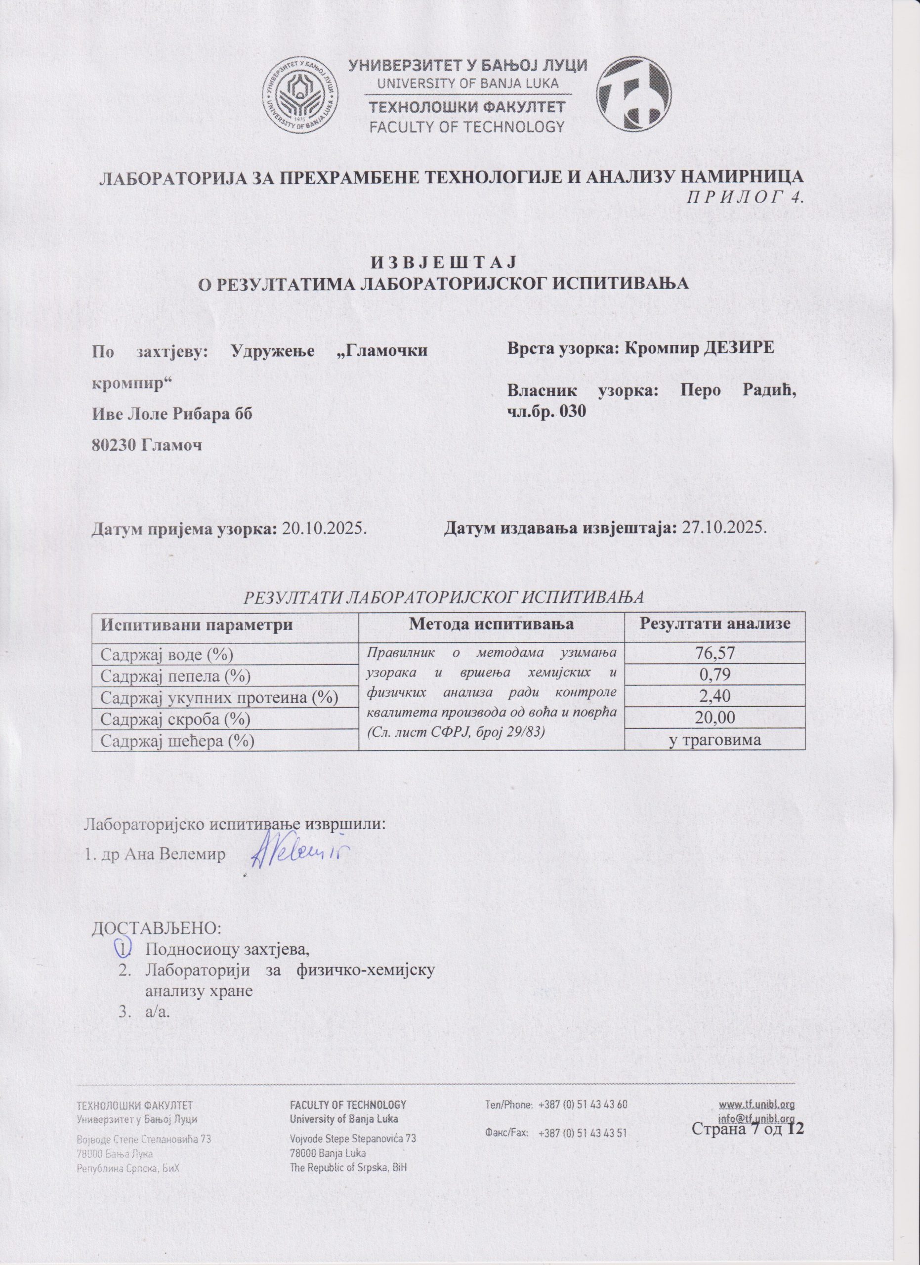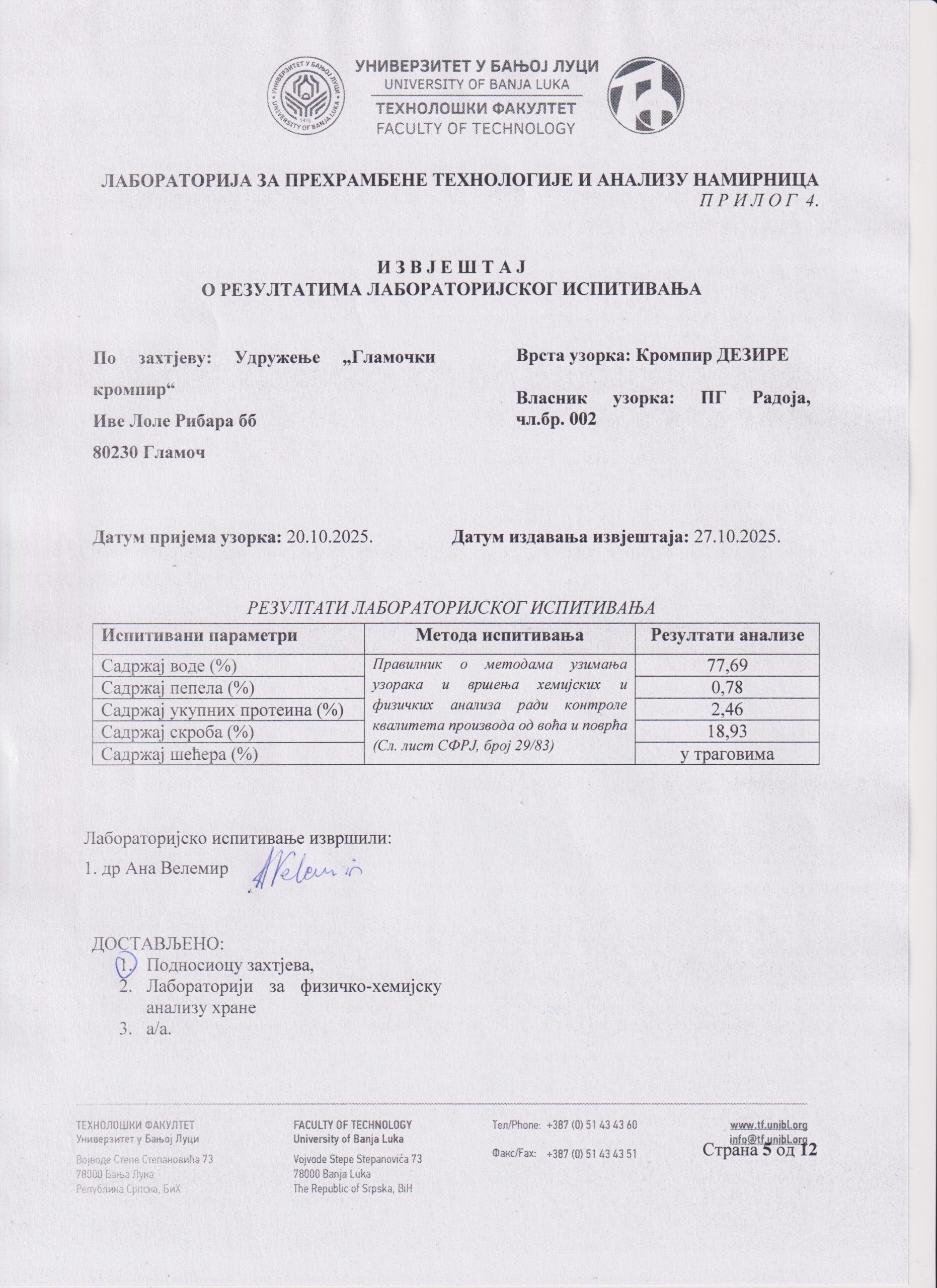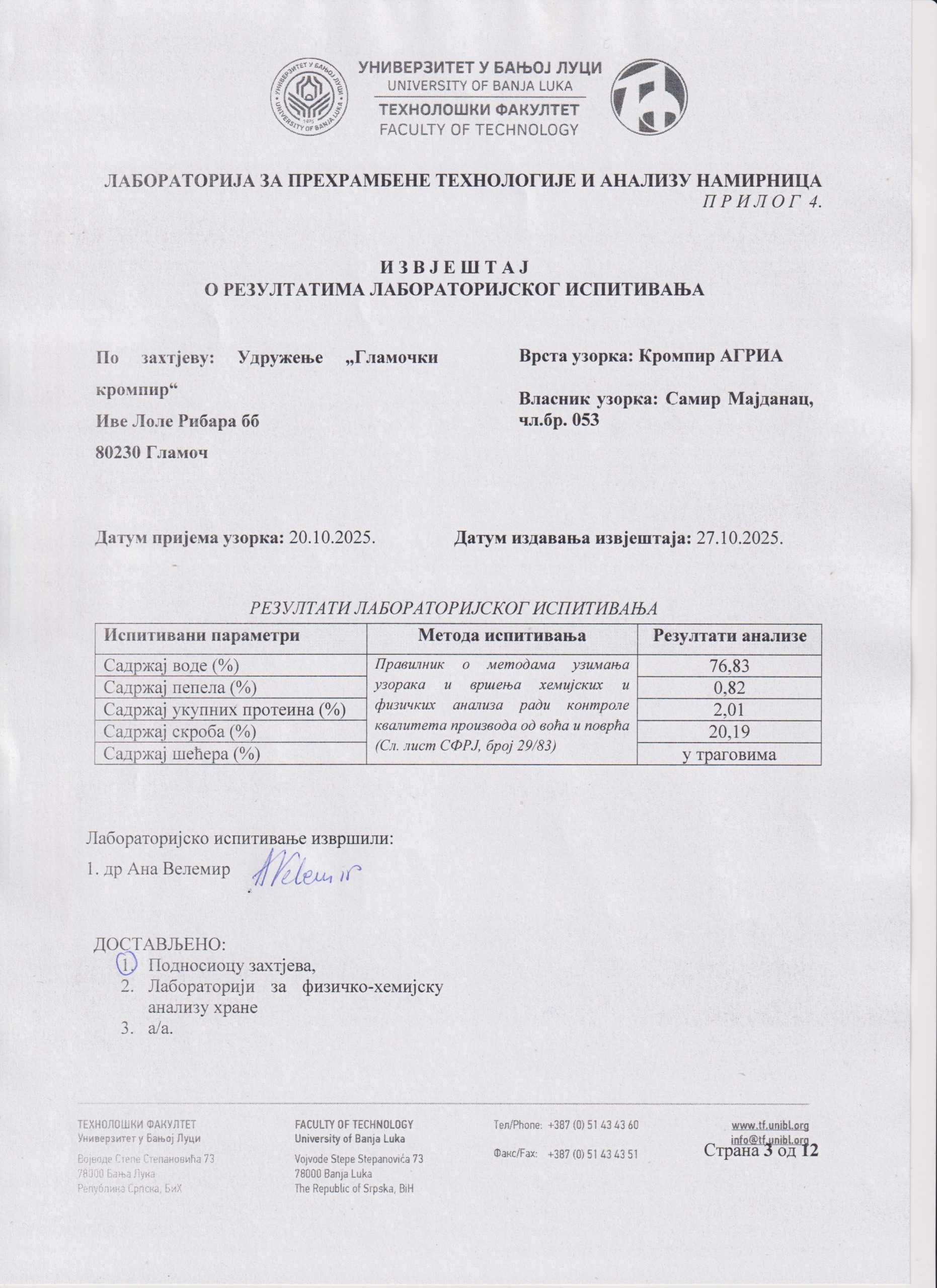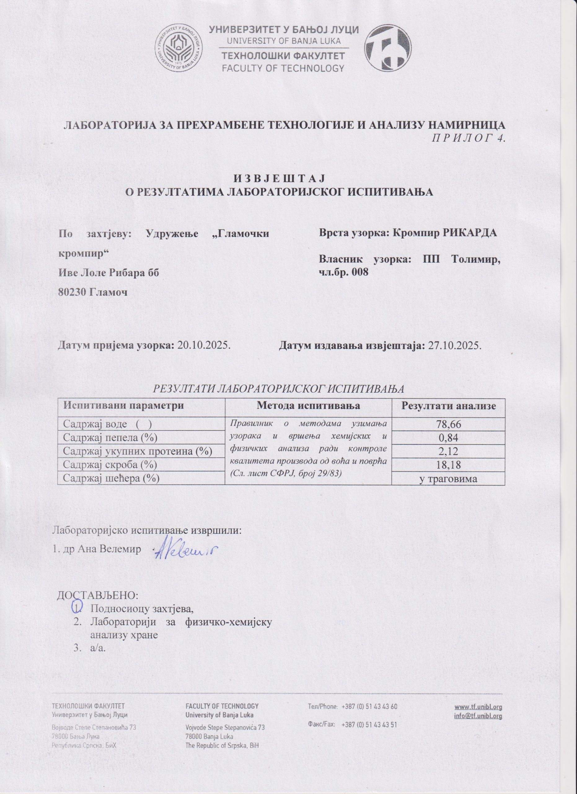 Klikom na registarski broj proizvođača možete vidjeti rezultat hemijske analize krompira tog proizvođača, koji izdaje Laboratorija za prehrambene tehnologije i biotehnologije Tehnološkog fakulteta u Banjaluci.