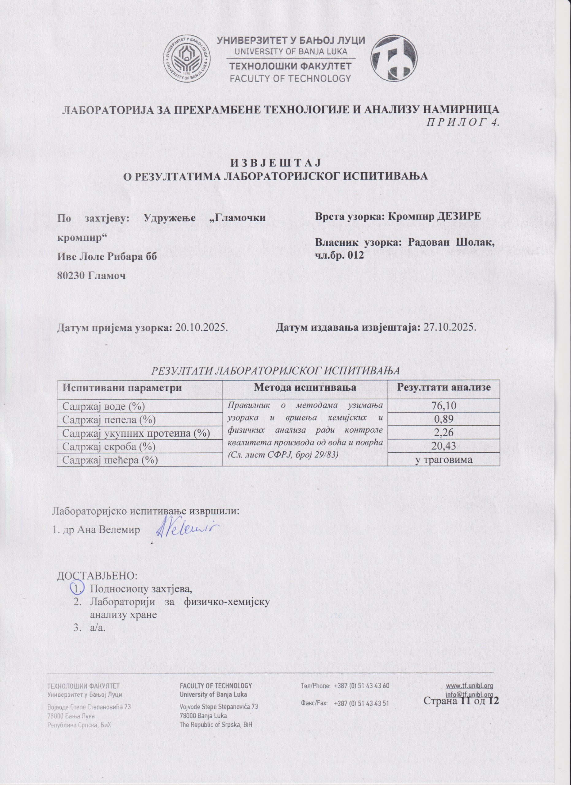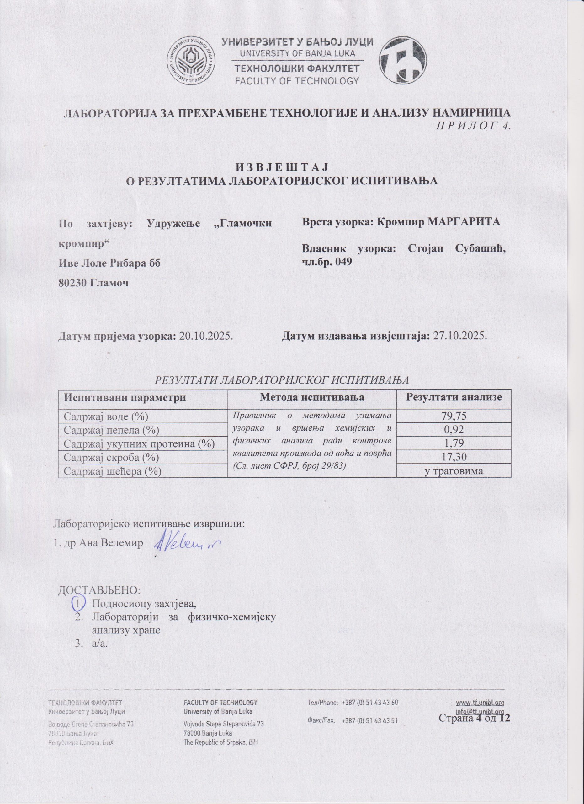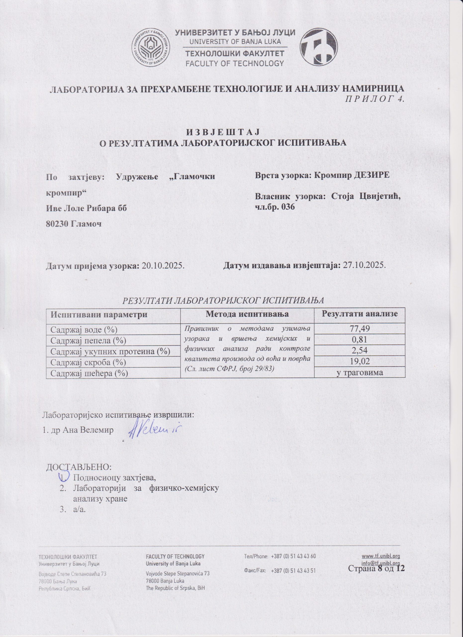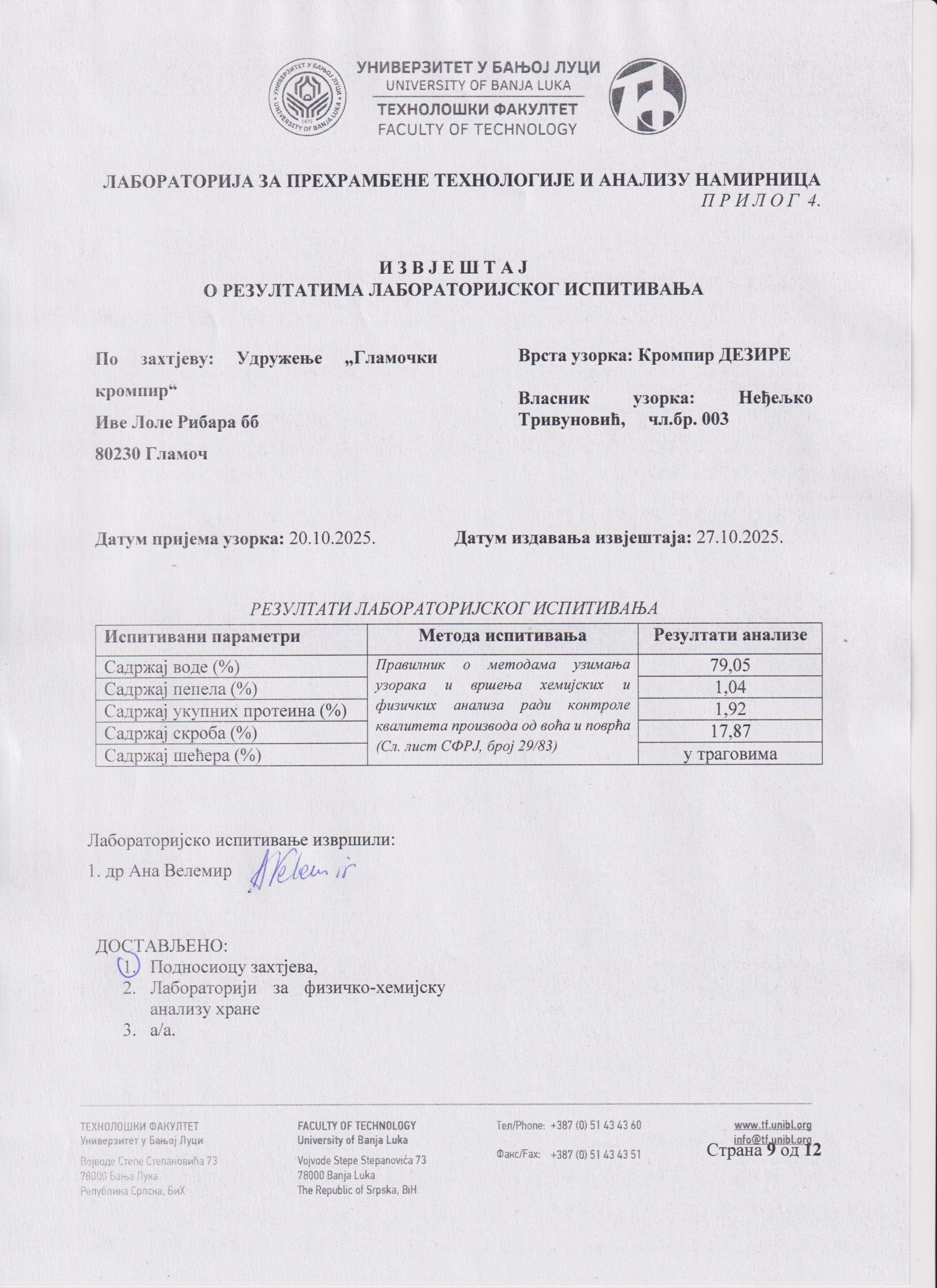 Klikom na registarski broj proizvođača možete vidjeti rezultat hemijske analize krompira tog proizvođača, koji izdaje Laboratorija za prehrambene tehnologije i biotehnologije Tehnološkog fakulteta u Banjaluci.