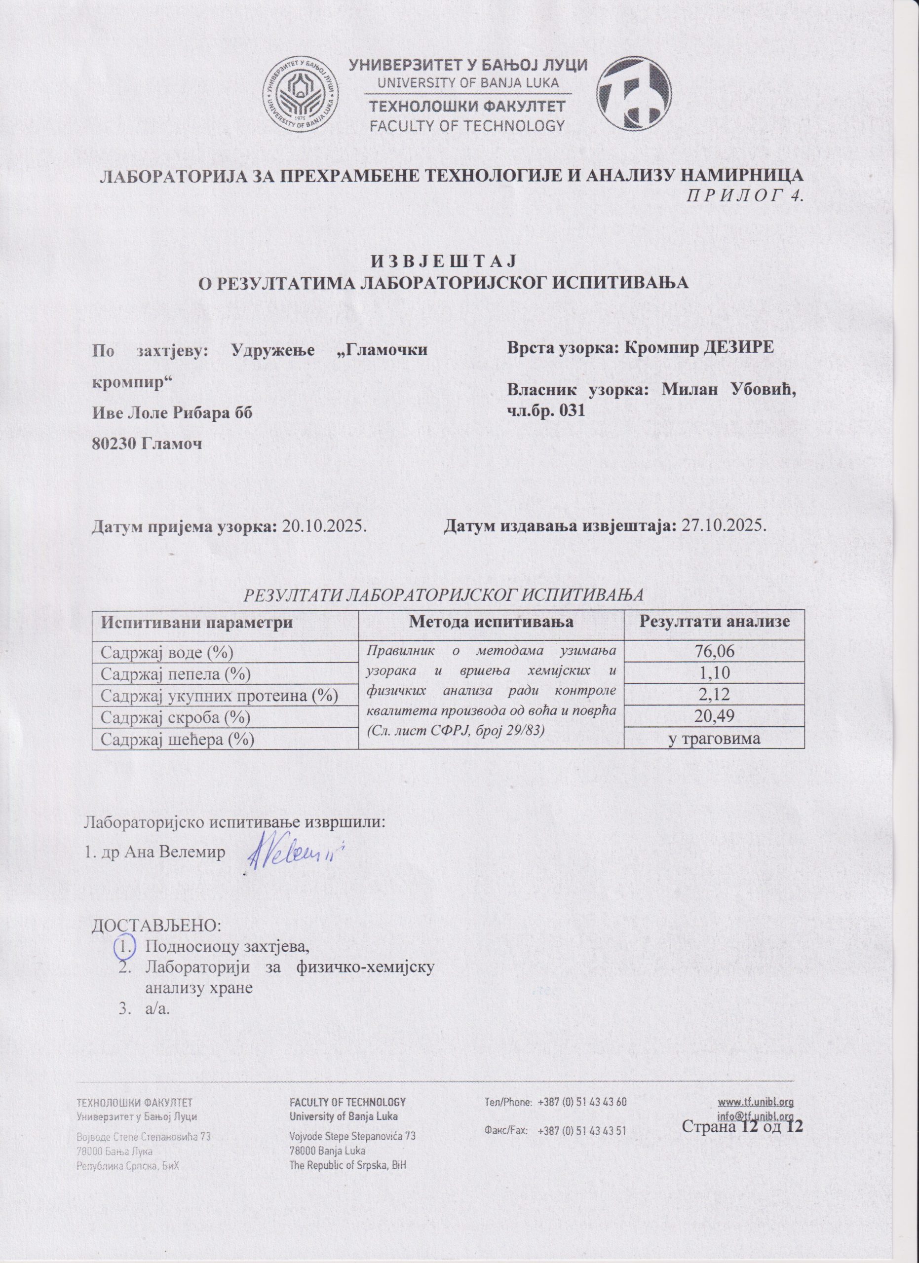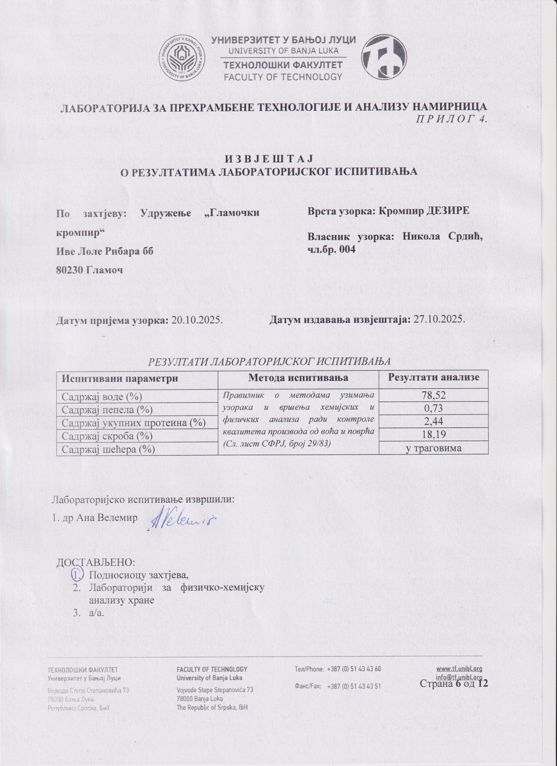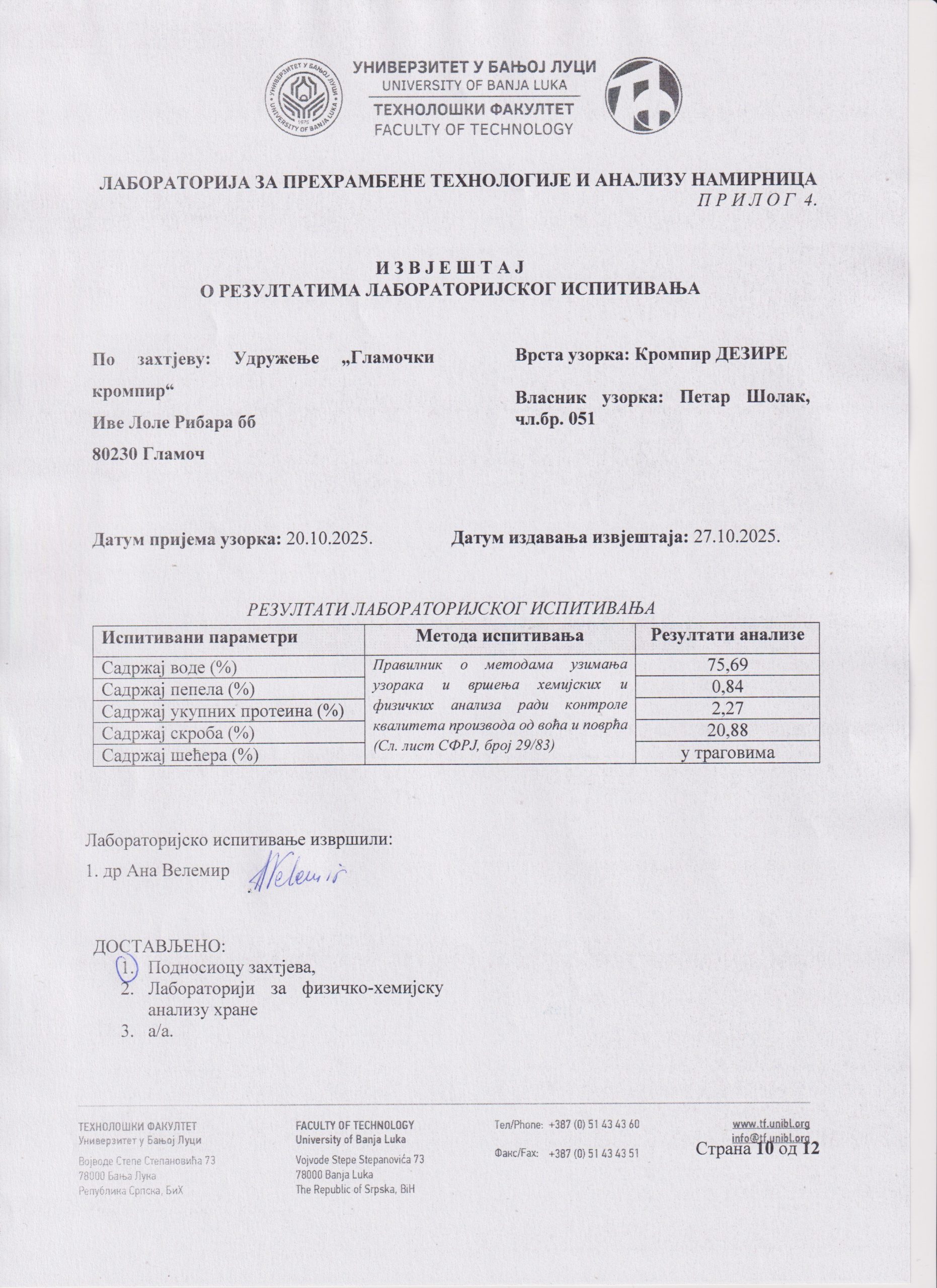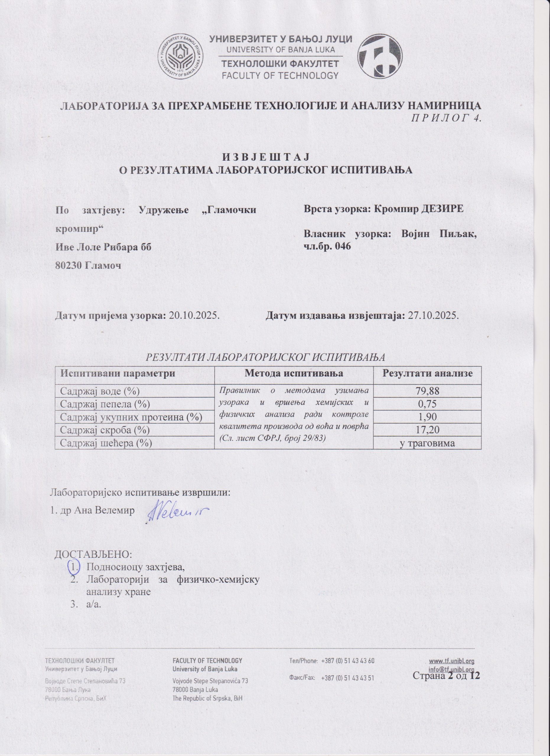 Klikom na registarski broj proizvođača možete vidjeti rezultat hemijske analize krompira tog proizvođača, koji izdaje Laboratorija za prehrambene tehnologije i biotehnologije Tehnološkog fakulteta u Banjaluci.